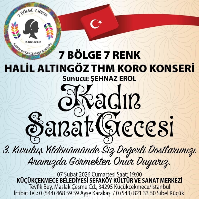 Derneğin “Aramızda Görmekten Onur Duyarız” davetiyle kamuoyuna duyurduğu etkinlik, 07 Şubat 2026 Cumartesi günü saat 19.00’da, Küçükçekmece Belediyesi Sefaköy Kültür ve Sanat Merkezinde gerçekleştirilecek. Davetiyesiz ve ücretsiz olarak düzenlenecek program, geniş katılımla bir kültür şölenine dönüşmeyi hedefliyor.