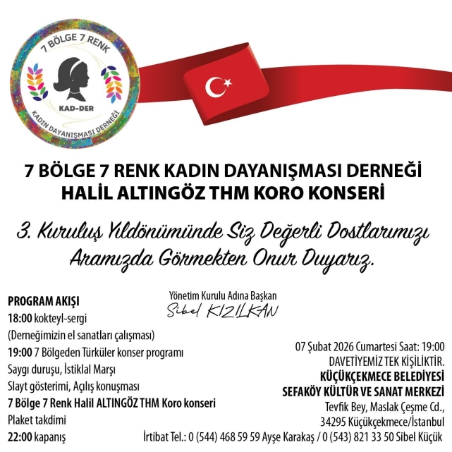 Türkiye’nin kültürel zenginliğini ve kadın dayanışmasının dönüştürücü gücünü aynı sahnede buluşturan 7 Bölge 7 Renk Kadın Dayanışması Derneği, 3. kuruluş yıl dönümünü özel bir konser programıyla kutlamaya hazırlanıyor. “7 Bölge 7 Renk” temasıyla düzenlenen Halil Altıngöz Türk Halk Müziği Koro Konseri, 7 Şubat’ta Küçükçekmece’de sanatseverlerle buluşacak.