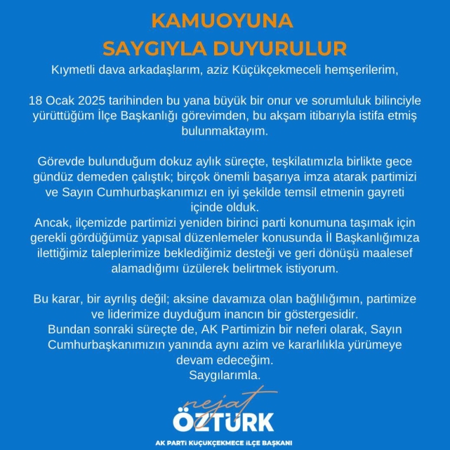 Öztürk, istifa kararının kişisel bir ayrılık anlamı taşımadığını vurgulayarak, partisine ve Cumhurbaşkanı Recep Tayyip Erdoğan’a bağlılığını sürdüreceğini ifade etti:“İlçemizde partimizi yeniden birinci parti konumuna taşımak için gerekli gördüğümüz yapısal düzenlemeler konusunda İl Başkanlığımıza ilettiğimiz taleplerimize beklediğimiz desteği ve geri dönüşü maalesef alamadığımı üzülerek belirtmek istiyorum.