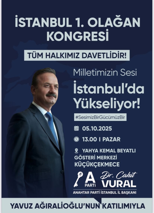 Türkiye siyasetinde yeni bir hareket olarak dikkat çeken Anahtar Parti, siyasi yolculuğunun en önemli dönemeçlerinden birine hazırlanıyor. Parti, 5 Ekim 2025 Pazar günü saat 13.00’te Küçükçekmece Yahya Kemal Beyatlı Gösteri Merkezi’nde gerçekleştirilecek olan İstanbul 1. Olağan İl Kongresi ile kamuoyunun karşısına çıkacak.