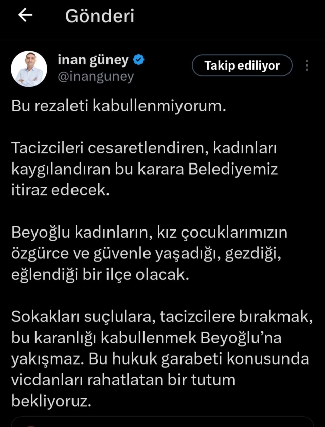 Başkan Güney, konuyla ilgili yaptığı açıklamada şu ifadeleri kullandı: “Bu rezaleti kabullenmiyorum. Tacizcileri cesaretlendiren, kadınları kaygılandıran bu karara belediyemiz itiraz edecek. Beyoğlu, kadınların ve kız çocuklarımızın özgürce ve güvenle yaşadığı, gezdiği, eğlendiği bir ilçe olacak. Sokakları suçlulara, tacizcilere bırakmak, bu karanlığı kabullenmek Beyoğlu’na yakışmaz. Bu hukuk garabeti konusunda vicdanları rahatlatan bir tutum bekliyoruz.”Kadına yönelik şiddet ve tacize karşı verilen bu karar, sosyal medyada geniş yankı buldu. Kadın hakları savunucuları, zanlıların serbest bırakılmasının toplumsal adaleti zedelediğini ve bu kararın kadınlar için büyük bir tehdit oluşturduğunu dile getirerek tepkilerini dile getirdiler.