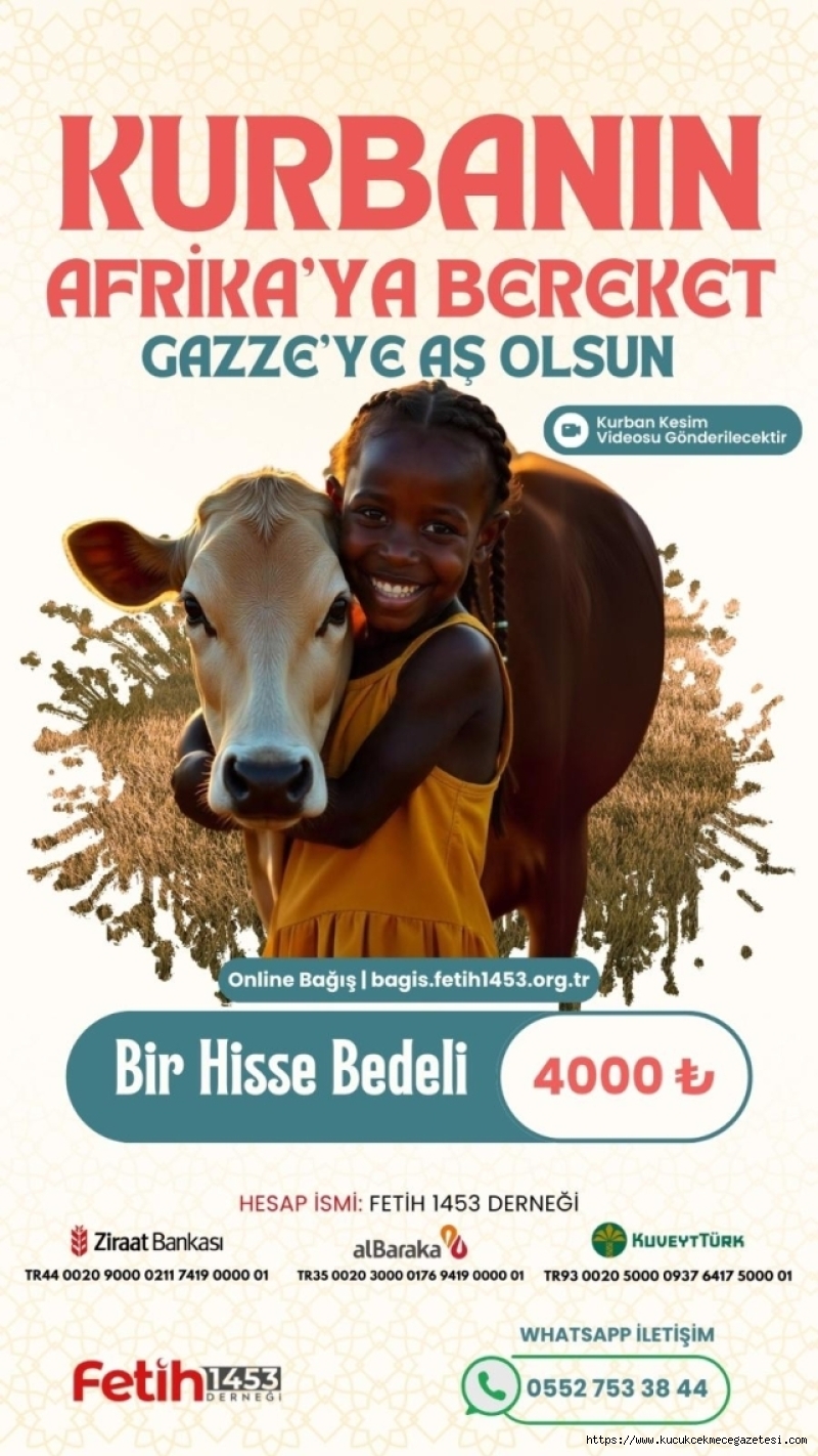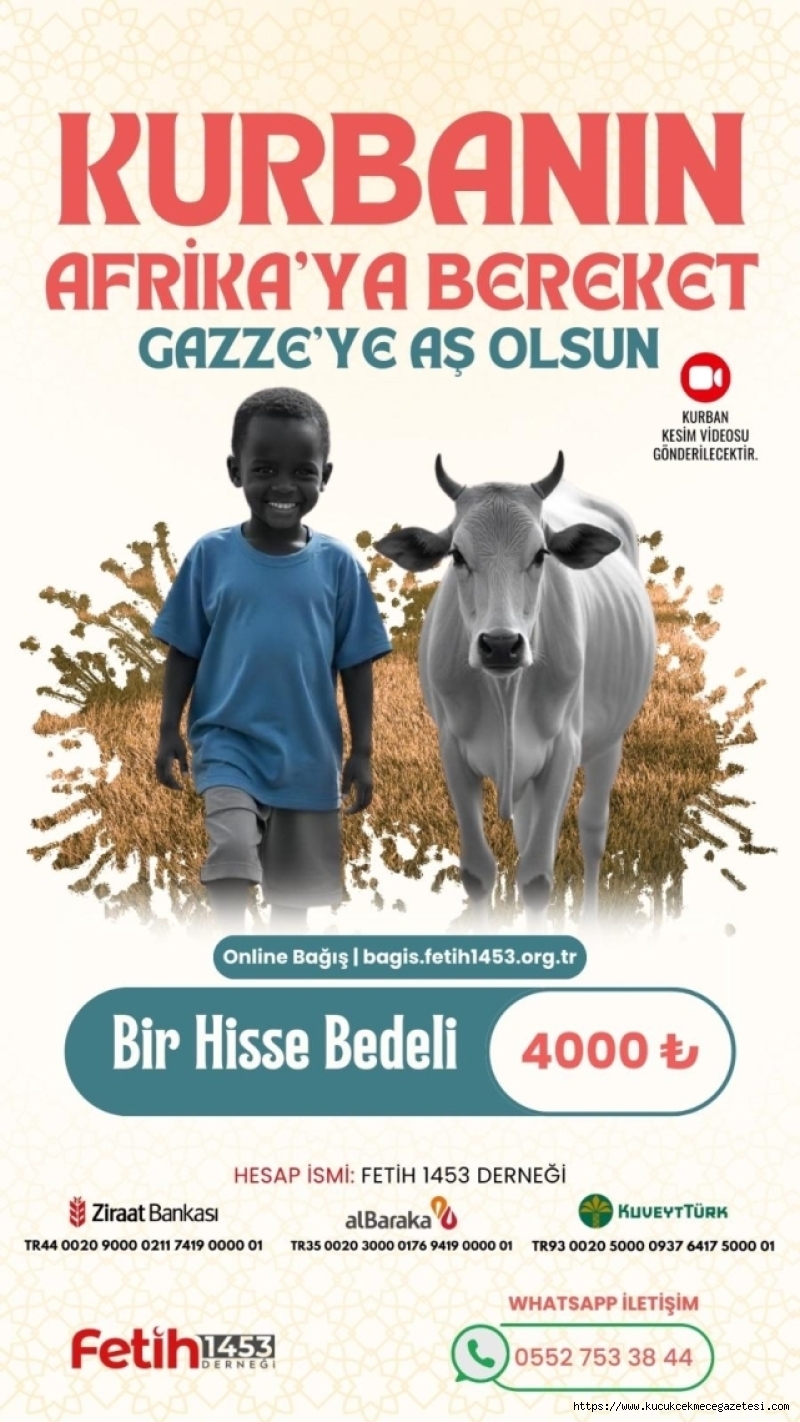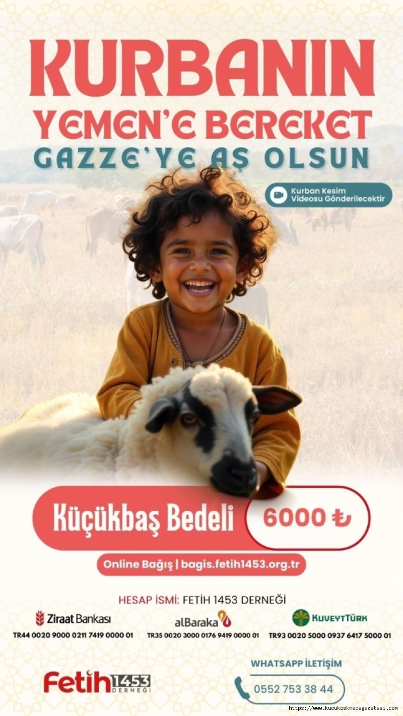 GAZZE'ye aş olsun...Kıymetli dostlar; Vacip kurban emanetlerinizi ibadet bilinci ile yıllardır olduğu gibi bu yıl da Türkiye’deki ihtiyaç sahibi ailelerimize, Afrika’ya ve ABD / İşgalci İsrail’in Gazze’ye desteklerinden dolayı bombardımana tuttuğu Yemenli kardeşlerimize ulaştırıyoruz.Aynı zamanda GAZZE’de vermiş olduğumuz sıcak yemek çalışmalarına çok istediği halde imkânı olmayan kardeşlerimize bir hayr kapısı aralıyoruz. Her bağışçımız ödemiş olduğu Vacip kurban bağışı içinde bir kişilik GAZZE'de yemek ikramı olacaktırBu vesileyle hem vacip kurban keserken hemde GAZZE’ye sıcak yemek bağışlamış olacaksınızVacip kurban bağışı Türkiye küçük baş bedeli 15.000 TLVacip kurban bağışı Afrika büyük baş hisse bedeli 4000 TL'dir.Vacip kurban bağışı Yemen küçük baş bedeli 6000 TL’dirBağışçılarımızı son üç gün kala arayarak ya da WhatsApp hattımızdan sesli mesaj ileterek vekalet alıyoruz.Kesilen kurbanlarınızın kesim videoları tarafınıza WhatsApp hattımız üzerinden bayram sonu gönderilmektedirKurban sonrası