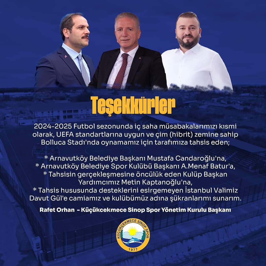 Rafet Orhan, bu tahsisin gerçekleşmesinde emeği geçen Arnavutköy Belediye Başkanı Mustafa Candaroğlu, Arnavutköy Belediye Spor Kulübü Başkanı A. Menaf Batur, ve tahsisin öncülüğünü yapan Kulüp Başkan Yardımcısı Metin Kaptanoğlu'na şükranlarını sundu. Ayrıca, İstanbul Valisi Davut Gül’e de bu süreçteki desteklerinden dolayı teşekkür etti.Orhan, "Bolluca Stadı'nda oynamak, takımımız için büyük bir avantaj olacak. Bu karara öncülük eden ve destek veren herkese camiamız ve kulübümüz adına minnettarım," dedi.Bu tahsis, Küçükçekmece Sinop Spor’un hem saha avantajını hem de taraftar desteğini artırarak sezon boyunca önemli başarılara imza atmasını hedefliyor.