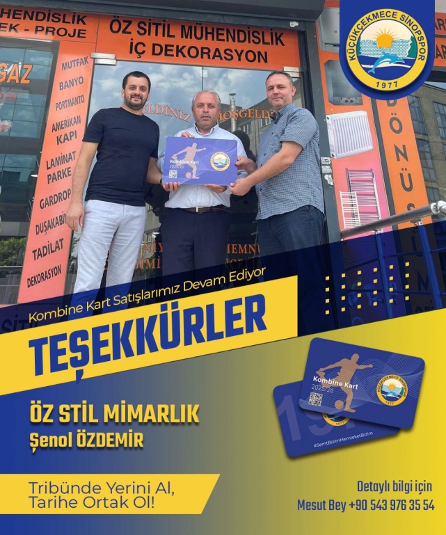 Küçükçekmece Sinopspor, yeni sezon öncesi taraftarını tribünlere davet ederken kombine kart satışları büyük bir ilgiyle devam ediyor. Kulüp yönetimi,, hem saha içindeki başarı hedefi hem de tribünlerdeki coşkunun artması için kampanyayı güçlendiren isimlere özel teşekkürlerini iletiyor. Bu kapsamda,, Öz Stil Mimarlık’ın değerli sahibi Şenol Özdemir’in takıma sağladığı anlamlı destek, camiada memnuniyetle karşılandı.