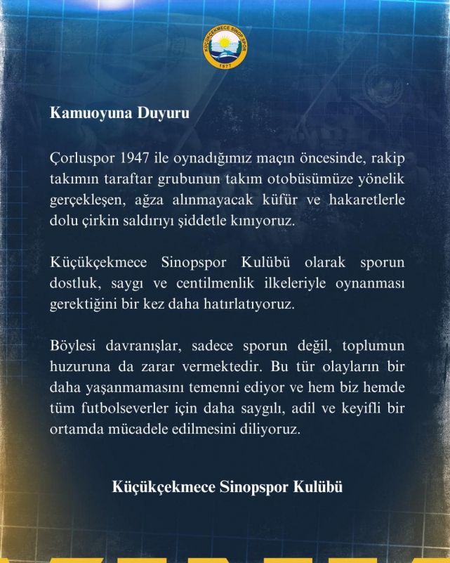 Kulüp tarafından yapılan açıklamada, rakip takımın taraftar grubunun otobüse yönelik küfür ve hakaret dolu sözlü saldırıda bulunduğu belirtilirken, bu tür olayların sporun ruhuna zarar verdiği vurgulandı. “Spor, dostluk, saygı ve centilmenlik çerçevesinde oynanmalıdır” ifadelerine yer veren Küçükçekmece Sinopspor, benzer olayların bir daha yaşanmaması gerektiğini belirterek, futbolun daha adil, saygılı ve keyifli bir ortamda oynanması gerektiğinin altını çizdi.Yaşanan bu üzücü olay sonrası yetkililerin nasıl bir adım atacağı merak konusu olurken, futbol camiası da yaşanan saldırıya tepki göstermeye devam ediyor.