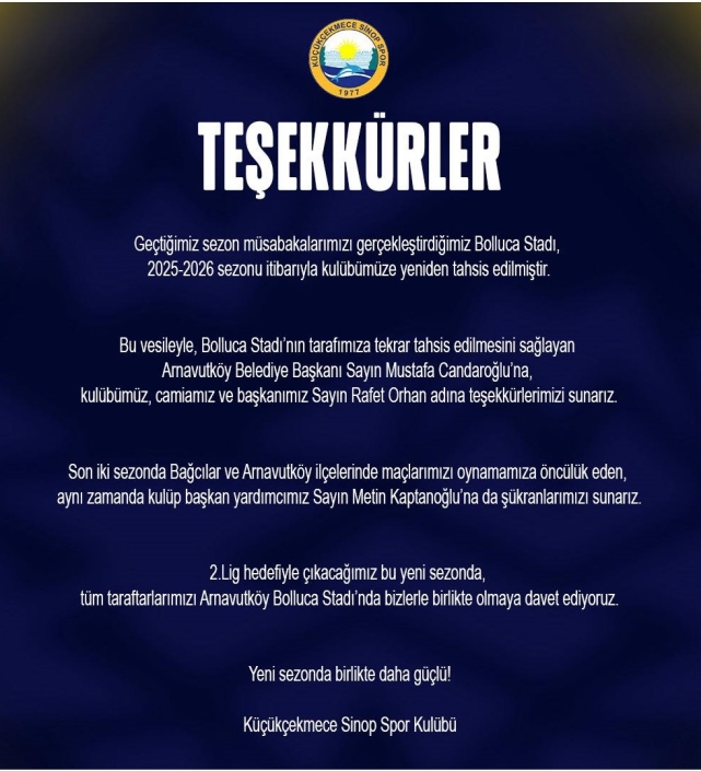 “Geçtiğimiz yıl başarılı bir sezon geçirdiğimiz Bolluca Stadı’nı bu sezon itibariyle tekrar tarafımıza tahsis eden Arnavutköy Belediye Başkanı Sayın Mustafa Candaroğlu’na, kulübüm, camiam ve şahsım adına şükranlarımı sunuyorum.”