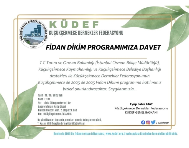 Küçükçekmece Dernekler Federasyonu (KÜDEF), 11 Kasım Milli Ağaçlandırma Günü kapsamında çevreye ve gelecek nesillere anlamlı bir miras bırakmaya hazırlanıyor. “Umutları yarınlarla buluşturuyoruz” sloganıyla düzenlenen etkinlikte, 2025 fidan Küçükçekmece’de toprakla buluşturulacak. T.C. Tarım ve Orman Bakanlığı (İstanbul Orman Bölge Müdürlüğü), Küçükçekmece Kaymakamlığı ve Küçükçekmece Belediyesi’nin destekleriyle gerçekleştirilecek fidan dikim programı, sadece bir ağaçlandırma faaliyeti değil; aynı zamanda çevre bilincinin güçlendirilmesi, doğaya sahip çıkma sorumluluğunun toplum genelinde yaygınlaştırılması amacı taşıyor.